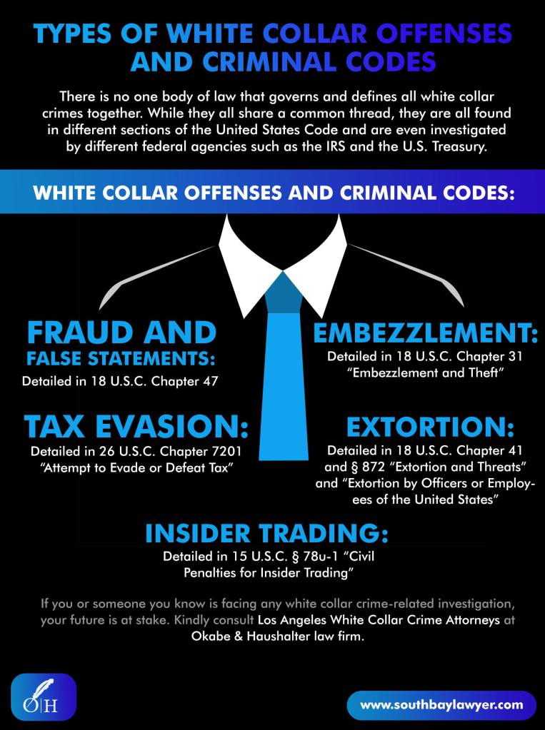 There is no one body of law that governs and defines all white collar crimes together. While they all share a common thread, they are all found in different sections of the United States Code and are even investigated by different federal agencies such as the IRS and the U.S. Treasury. If you or someone you know is facing any white collar crime-related investigation, your future is at stake. Kindly consult Los Angeles white collar crime attorneys at Okabe & Haushalter law firm.