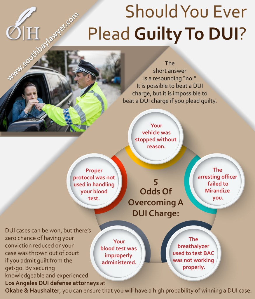 The short answer is a resounding “no.” It is possible to beat a DUI charge, but it is impossible to beat a DUI charge if you plead guilty. DUI cases can be won, but there’s zero chance of having your conviction reduced or your case was thrown out of court if you admit guilt from the get-go. By securing knowledgeable and experienced Los Angeles DUI defense attorneys at Okabe & Haushalter, you can ensure that you will have a high probability of winning a DUI case.