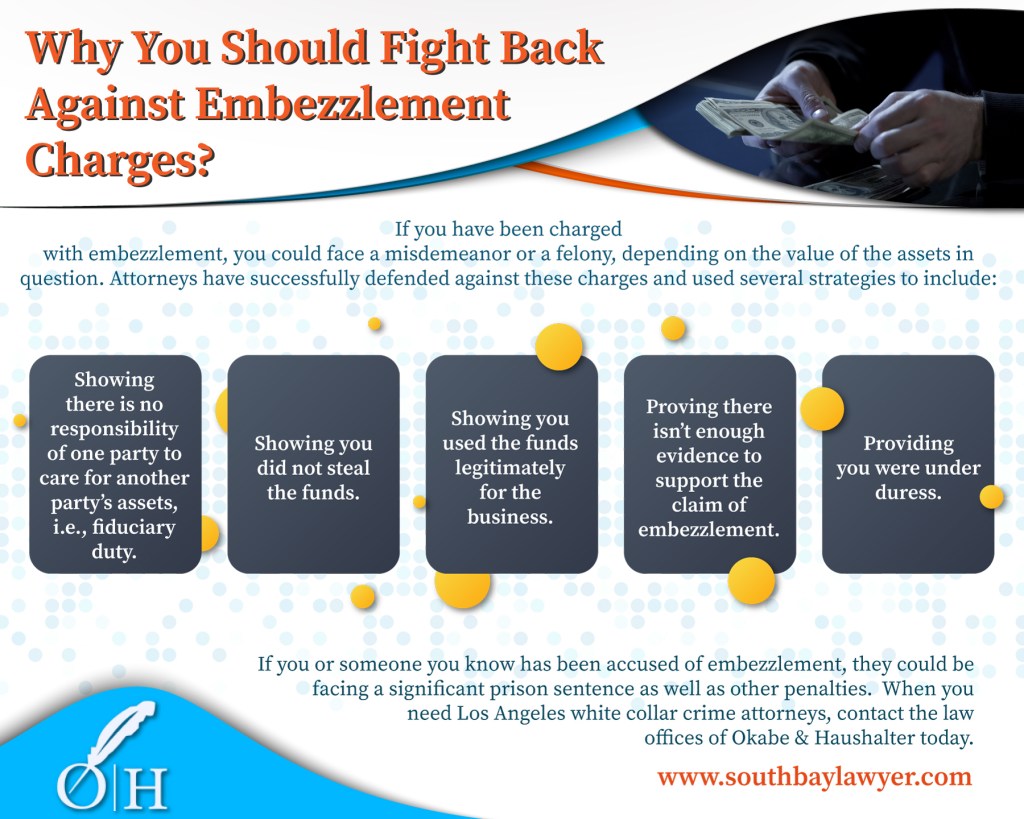 Embezzlement is known as employee theft and includes the act of somebody wrongfully appropriating funds that have been entrusted to their care but are owned by somebody else. Embezzlement is a type of fraud, and those facing these charges could end up serving significant time in jail or prison, along with other various criminal penalties. If you or someone you know has been facing embezzlement charges then you need Los Angeles white collar crime attorneys of Okabe & Haushalter today.